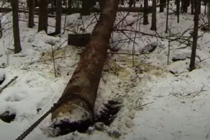 So now we have the idea and the chainsaw mill, all we need is the tree to convert into lumber. I ended up walking back into our bush behind our house and selected a massive spruce tree that had died. It needed to come out anyway and would supply me with large enough logs that I could easily get 20, 2 inch thick boards out of it. First I had to fell the tree which due to it's shear size it would not come down cleanly so some ingenuity came into play and I hand winched the base out till it finally dropped. Now that it's on the ground I limbed it and cut it up into 12 foot lengths. I then used a set of log tongs to lift it up onto stumps so it was at a manageable working height.