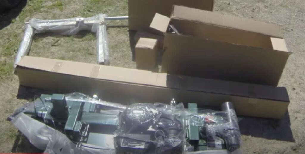 I purchased the portable sawmill from Woodland Mills and had it shipped to me. They gave me a shipping time and luckily I was home that day as a transport truck showed up at the end of my driveway with no real means of offloading an 800lb crate. Have something ready to offload a big crate. I used my tractor with forks and brought it right to the shop. The next day I started to assemble the unit. I built it on top of a trailer temporarily but you could do it anywhere you have a level spot.