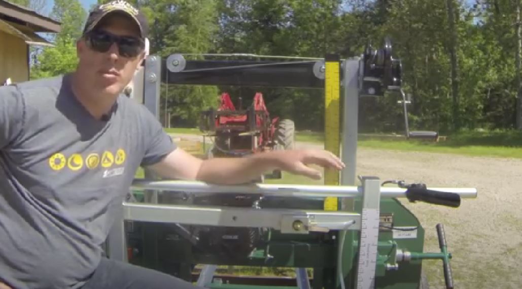 3. Check all the fluids, blade tension and set it for level. Now that everything is together there are few things you need to do to just finish the project off. On the motor, check fluid levels to be safe. Never assume things are filled etc. check oil and gas and fill as needed. Once you put the blade on make sure the tension is set properly and it is running true and straight. This is super important for good cuts down the road. Last thing I found was to set it for level cuts. They have an adjustment cable to make sure the blade runs true. Using a level, set this so the blade is exactly parallel to the rails. Once this is done then you are pretty much ready to start cutting lumber.